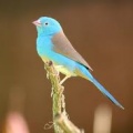 The Blue-Capped Cordon Bleu are very striking African birds. The male's head, body and tail are deep sky blue in color with the wings, underbelly and back being fawn/beige. Females lack the sky blue coloring covering the whole head instead, the top of the hen's head is the same color as the wings.
