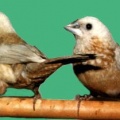 Males and females are identical in appearance. The only way to sex them is by behavior. The males will sing a song typical of many mannikins. With an upstretched neck and fluffed feathers, he will sing his warbling song and bounce back and forth on the perch while approaching the hen. There are differences in the male and female contact calls, but these are difficult to describe and you'll have to hear them to pick them out.