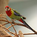 1: Western Rosella:26 cm long, and the smallest rosella. The male is mainly red with yellow cheek patches, green rump, and a dark green tail. The female is duller , with a mainly green head,reddish forehead and yellow cheeks