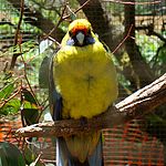 3: Green Rosella : 7 cm long, and the largest rosella. It has a yellow headand underparts with blue cheeks and red frontal band above the bill.